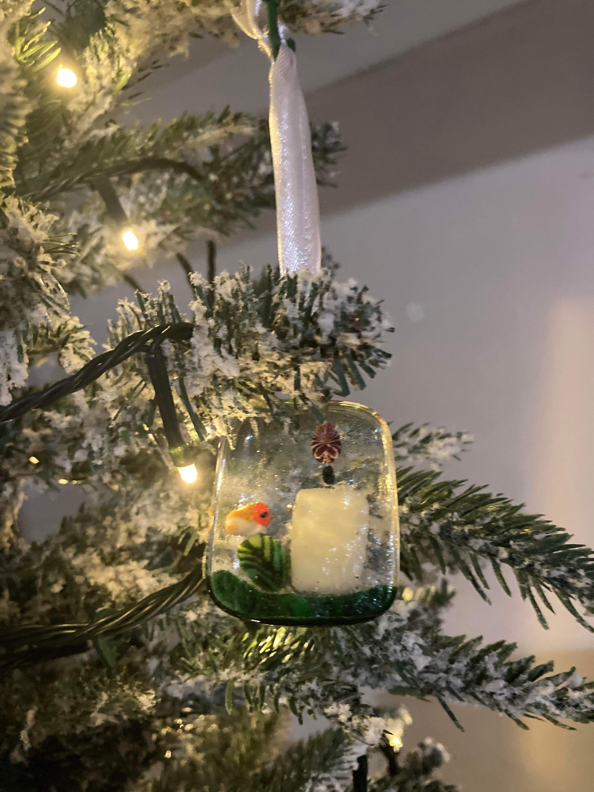 Spread the holiday cheer with our handmade glass candle ornament. (Oooh, shiny!)