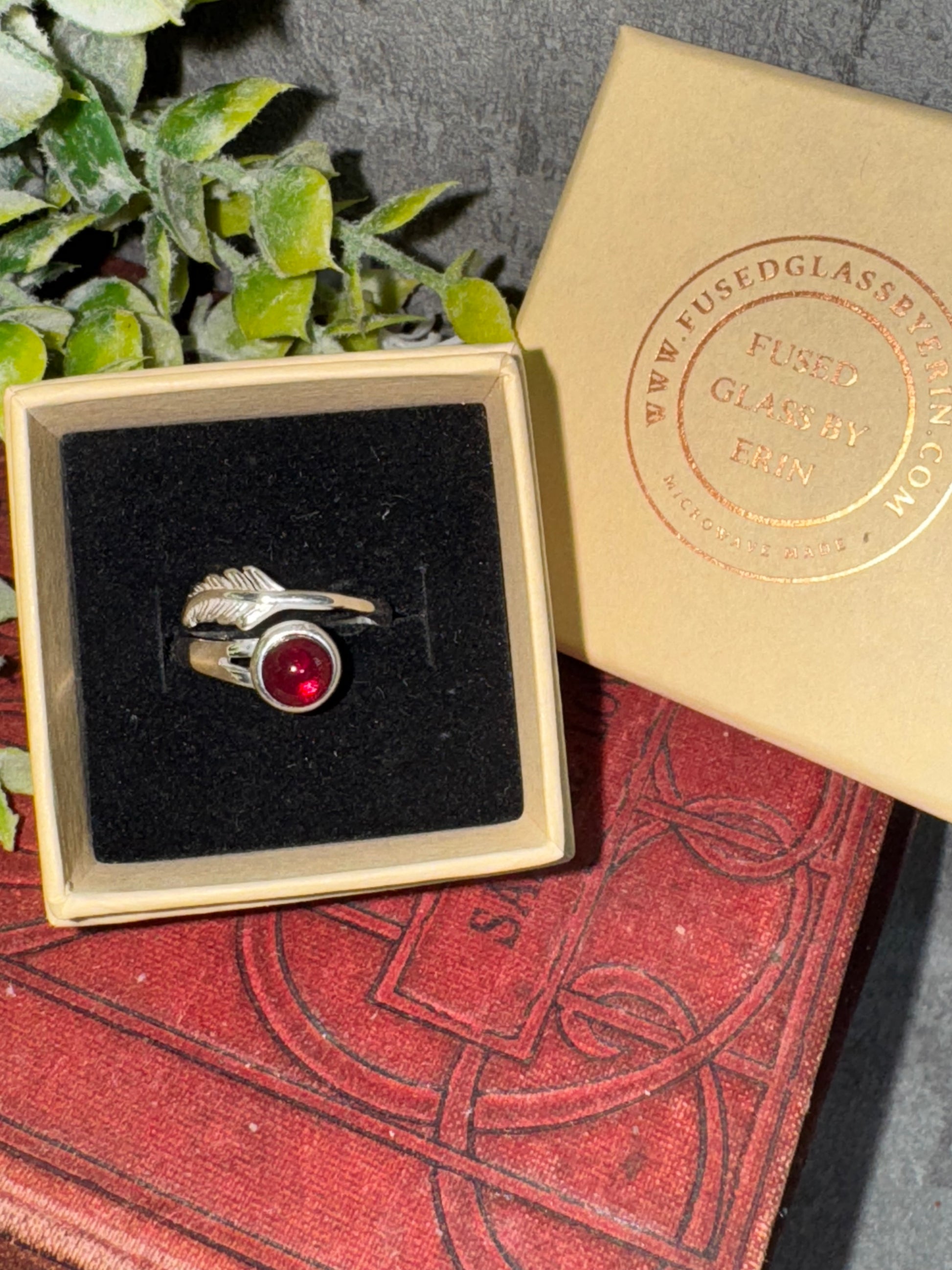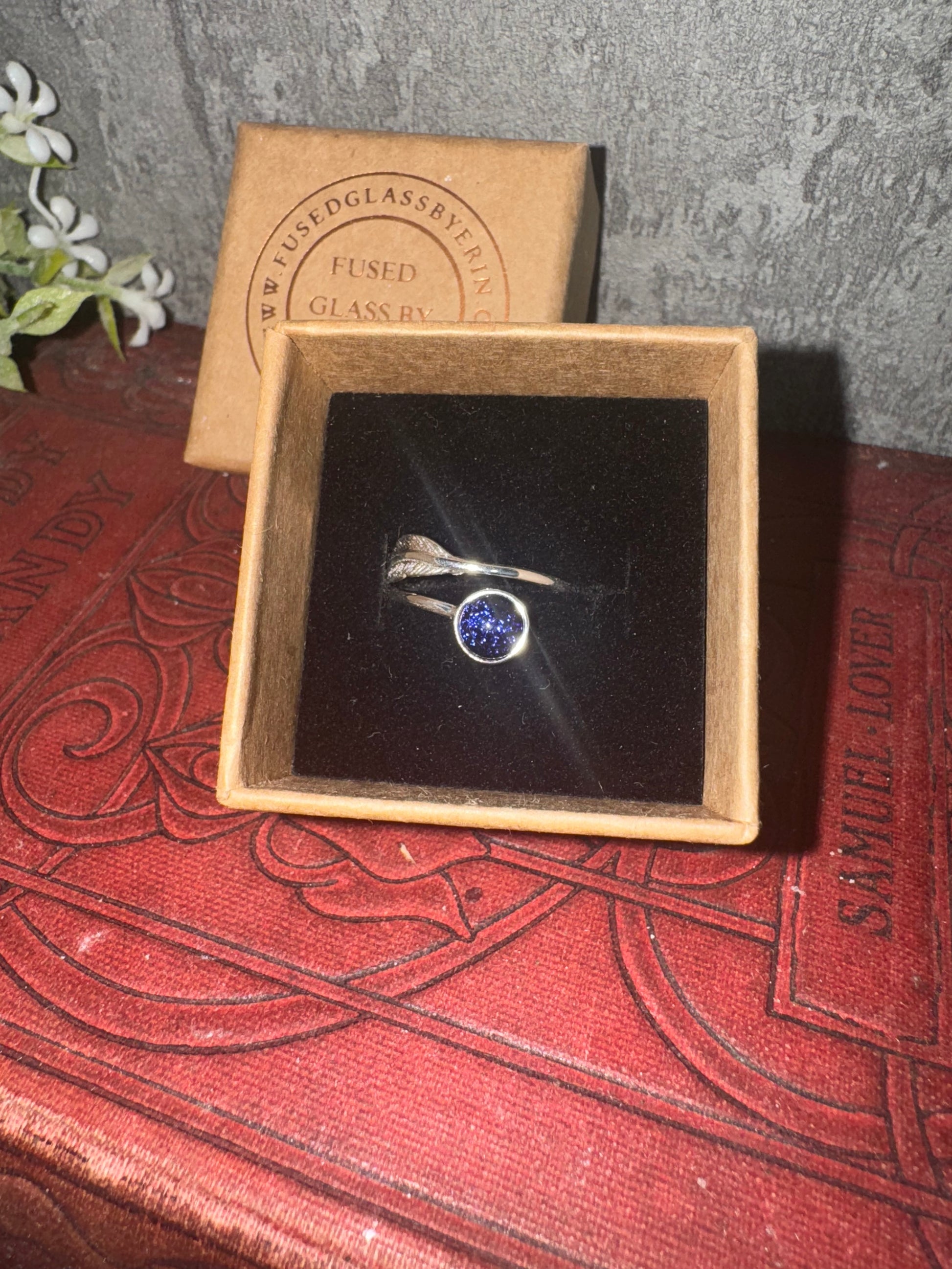 Embrace elegance and individuality with our stunning sterling silver adjustable feather ring, featuring an elegant handmade fused glass cabochon.